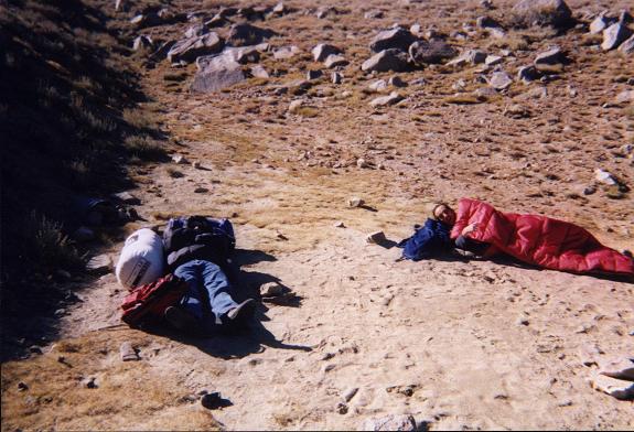 Dale (at photo right) and Spencer lie in or on their sleeping bags before erecting a tent. |