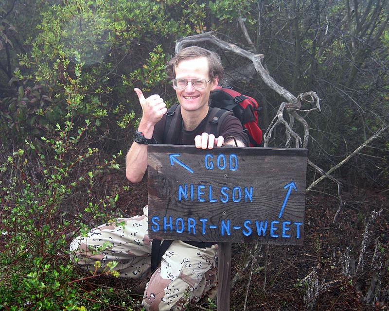 Nielson benchmark is near a little-known summit which has about 1,150 feet of prominence. Though in Riverside county, its proximity to Interstate 15 near the county line makes it a convenient target for San Diego-based, prominence-oriented peakbaggers. Though obscure in a sense, it is actually quite impressive if you know how to identify it; it is the "prominent" (in the lay sense of the term), bouldery, brush-covered mountain visible from Interstate 15 for several miles in both directions. The summit is crowned by a single, large, pointed, triangular boulder. The most convenient access to the mountain is from the vicinity of the Rainbow Conservation Camp (RCC), a California Department of Corrections facility for adult female inmates. Several days before my visit to the peak, I called the conservation camp at 760-728-2554 to inquire about access and asked if there were any special precautions we should take when in or near the camp. The officer said it shouldn't be a problem, but that I should check in at the front office upon arrival for any special instructions; and so that they would be aware of what we were doing, so that the corrections staff would not take any undue concern about an unknown group of people skulking around near the camp. On 2007 April 8, Adam Helman, Richard Carey, Terry Flood, and I convened at the Park and Ride by the Mobil station at Interstate 15 and CA Route 76. The preferred way to get to the peak from Interstate 15 approaching from the south is to exit at Mission Road, turn east at the top of the exit ramp, and then immediately turn left (north) onto Old Highway 395. Reset or note your odometer at this point. At 1.5 miles, turn right onto Rainbow Glen. (A left turn at the same intersection would take you under the freeway, but there are no interchange ramps.) Rainbow Glen soon becomes Rainbow Valley Road. At 2.4 miles, Rainbow Valley Road turns 45° left at a small triangle intersection. Go straight ahead on 8th Street and immediately cross Camino Rainbow. At this point, brown signs begin to show the way to the RCC. At 2.6 miles, the road abruptly turns 90° to the right and becomes Rice Canyon Road. At 2.7 miles, turn left at RCC sign onto Rainbow Heights Road, which climbs and winds. At 4.5 miles is a Y-junction where Rainbow Crest Road comes in at a sharp angle from the right. At 4.6 miles is a 5-way intersection where you make a 45° right turn onto Rainbow Heights Road East, indicated by an RCC sign. At 6.6 miles, you arrive at the camp, an insecure facility with a picket fence along the front. The roads are paved the entire distance. We parked outside the office but found it locked on this Easter Sunday. After searching around for a couple of minutes trying to find someone to talk to, a corrections officer appeared. I explained our plan. He said we should avoid the interior of the camp, but there would be no problem staying around the perimeter. We parked our car on an unpaved turnout just outside the front fence, donned our hiking boots, shouldered our packs, and went on our way. The weather was dreary, overcast with intermittent drizzle. We re-entered the camp and immediately turned left along the fence and passed to the left of a fire station next to the camp. We followed a road in this direction which we could see through the trees. After a few minutes, however, we realized that this road headed west, not north as we desired, so we returned to the fire station and headed north along a gravel parking lot behind the fire station. We followed a network of roads passing to the right of a hill topped by a concrete water tank and then to the left of a small reservoir. Just past the reservoir we proceeded though a gap in a barbed wire fence (probably the county line), and found a trail heading through boulders and brush up the ridge ahead. As we climbed up into the clouds, visibility dropped to less then 100 yards and there were no views. We were now in an area that harbored a complex network of usually well-maintained but unsigned trails. Much of the area smelled faintly of burned wood; and although there did not appear to have been a major wildfire, the ground was sometimes smudged in soot and/or littered with small charred wood chips. We suspect that this area is used as a firefighter training ground. After some trial and error, we found a good trail that climbed directly up the ridge toward our goal. At about 1,950 feet, the trail leveled off and we encountered an unsigned junction at which we turned right, followed about a minute later by a signed junction which indicated "SHORT-N-SWEET" to the right; "GOD" and "NIELSON" to the left. We chose left.