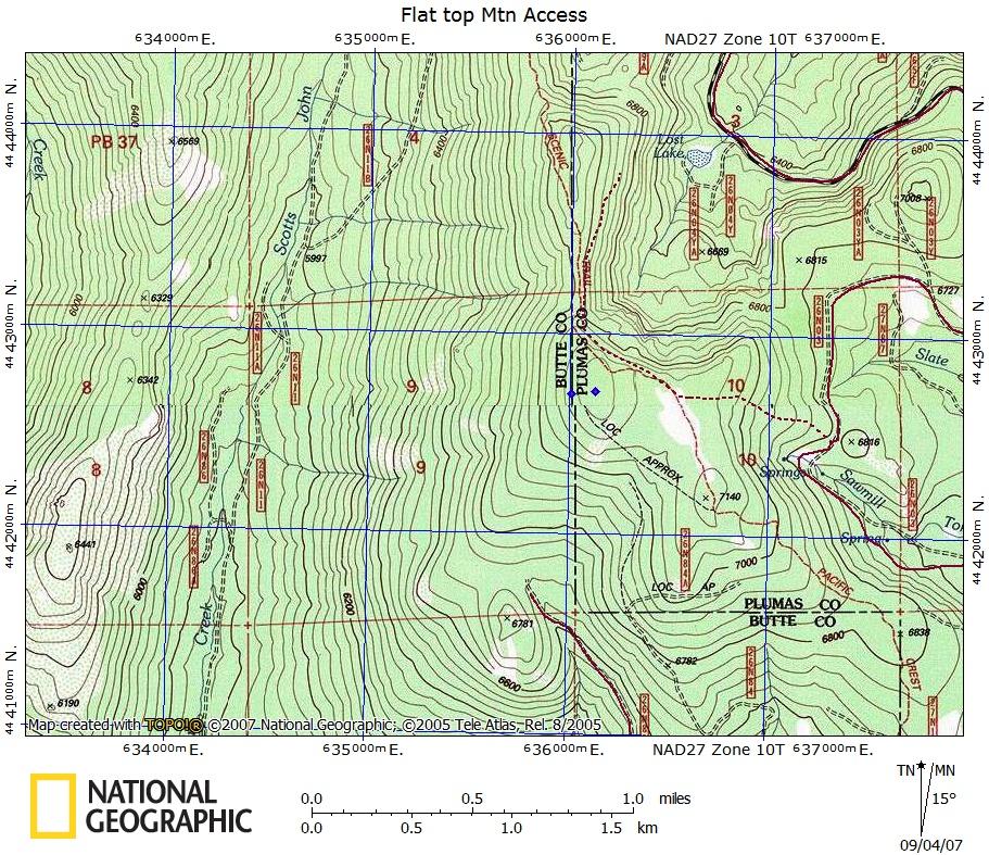 My GPS read 636010E, 4442698N (NAD27) at 7,142 feet, which corrected for the fact