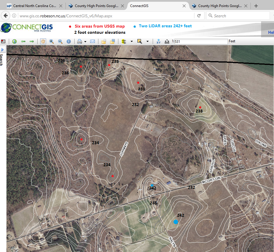 When Charlie Zerphey and I visited the six spots in Robeson County NC last year, I noticed that McGirt Gin Road crosses a slight ridge that was not shown on the USGS quad. Since then, Robeson County has added 2-foot contour maps to its GIS site, and it appears that this ridge may indeed be the highest point in Robeson County.