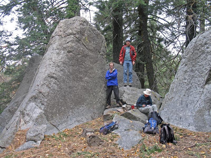 The middle boulder outcrop from a different angle. Gail inspects a summit register. |