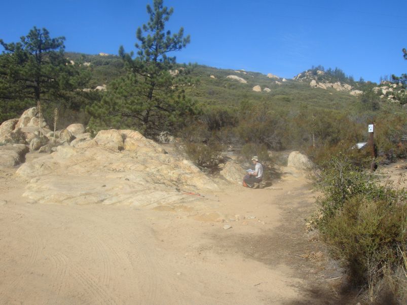 Instead, the obvious path continues southwest, terminating in a set of boulders represented on the topo chart as a southwest area with coordinates (32.75624° N, 116.59055° W). Here we drop packs and bushwhack to a boulder's top with good views - while hopefully satisfying Max that he climbed Corte Madera Mountain. The central area at (32.75696° N, 116.59016° W) features an unclimbable boulder shaped like an upended "egg", some 30 feet tall and completely vertical on all sides. There are no sizable handholds, and the only way it might be surmounted is by throwing a rope over its top, securing it on the opposite side, and jumaring!