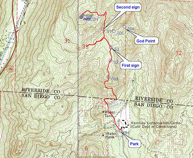 Nielson benchmark is near a little-known summit which has about 1,150 feet of prominence. Though in Riverside county, its proximity to Interstate 15 near the county line makes it a convenient target for San Diego-based, prominence-oriented peakbaggers. Though obscure in a sense, it is actually quite impressive if you know how to identify it; it is the "prominent" (in the lay sense of the term), bouldery, brush-covered mountain visible from Interstate 15 for several miles in both directions. The summit is crowned by a single, large, pointed, triangular boulder. The most convenient access to the mountain is from the vicinity of the Rainbow Conservation Camp (RCC), a California Department of Corrections facility for adult female inmates. Several days before my visit to the peak, I called the conservation camp at 760-728-2554 to inquire about access and asked if there were any special precautions we should take when in or near the camp. The officer said it shouldn't be a problem, but that I should check in at the front office upon arrival for any special instructions; and so that they would be aware of what we were doing, so that the corrections staff would not take any undue concern about an unknown group of people skulking around near the camp. On 2007 April 8, Adam Helman, Richard Carey, Terry Flood, and I convened at the Park and Ride by the Mobil station at Interstate 15 and CA Route 76. The preferred way to get to the peak from Interstate 15 approaching from the south is to exit at Mission Road, turn east at the top of the exit ramp, and then immediately turn left (north) onto Old Highway 395. Reset or note your odometer at this point. At 1.5 miles, turn right onto Rainbow Glen. (A left turn at the same intersection would take you under the freeway, but there are no interchange ramps.) Rainbow Glen soon becomes Rainbow Valley Road. At 2.4 miles, Rainbow Valley Road turns 45° left at a small triangle intersection. Go straight ahead on 8th Street and immediately cross Camino Rainbow. At this point, brown signs begin to show the way to the RCC. At 2.6 miles, the road abruptly turns 90° to the right and becomes Rice Canyon Road. At 2.7 miles, turn left at RCC sign onto Rainbow Heights Road, which climbs and winds. At 4.5 miles is a Y-junction where Rainbow Crest Road comes in at a sharp angle from the right. At 4.6 miles is a 5-way intersection where you make a 45° right turn onto Rainbow Heights Road East, indicated by an RCC sign. At 6.6 miles, you arrive at the camp, an insecure facility with a picket fence along the front. The roads are paved the entire distance. We parked outside the office but found it locked on this Easter Sunday. After searching around for a couple of minutes trying to find someone to talk to, a corrections officer appeared. I explained our plan. He said we should avoid the interior of the camp, but there would be no problem staying around the perimeter. We parked our car on an unpaved turnout just outside the front fence, donned our hiking boots, shouldered our packs, and went on our way. The weather was dreary, overcast with intermittent drizzle. We re-entered the camp and immediately turned left along the fence and passed to the left of a fire station next to the camp. We followed a road in this direction which we could see through the trees. After a few minutes, however, we realized that this road headed west, not north as we desired, so we returned to the fire station and headed north along a gravel parking lot behind the fire station. We followed a network of roads passing to the right of a hill topped by a concrete water tank and then to the left of a small reservoir. Just past the reservoir we proceeded though a gap in a barbed wire fence (probably the county line), and found a trail heading through boulders and brush up the ridge ahead. As we climbed up into the clouds, visibility dropped to less then 100 yards and there were no views. We were now in an area that harbored a complex network of usually well-maintained but unsigned trails. Much of the area smelled faintly of burned wood; and although there did not appear to have been a major wildfire, the ground was sometimes smudged in soot and/or littered with small charred wood chips. We suspect that this area is used as a firefighter training ground. After some trial and error, we found a good trail that climbed directly up the ridge toward our goal. At about 1,950 feet, the trail leveled off and we encountered an unsigned junction at which we turned right, followed about a minute later by a signed junction which indicated "SHORT-N-SWEET" to the right; "GOD" and "NIELSON" to the left. We chose left.