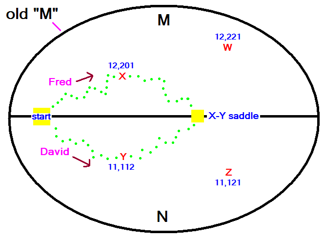 Meanwhile David starts counterclockwise, heading south and then east, walking over Y's summit. He continues east and meets A at the Peak X - Peak Y saddle.